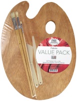 Art Advantage wood palette value pack. Oil finished wood oval palette with thumbhole, includes three free bristle brushes and two plastic palette knives.